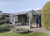 De voortuin met gevarieerde beplanting grenst aan de oprit en de carport, die tevens als eigen achterom fungeert. In de achtertuin, op het zuiden, zie je gras, borders met beplanting, een kleine vijver en een groot terras. In de tuin staan een houten berging en een stenen tuinhuis met overdekt terras.