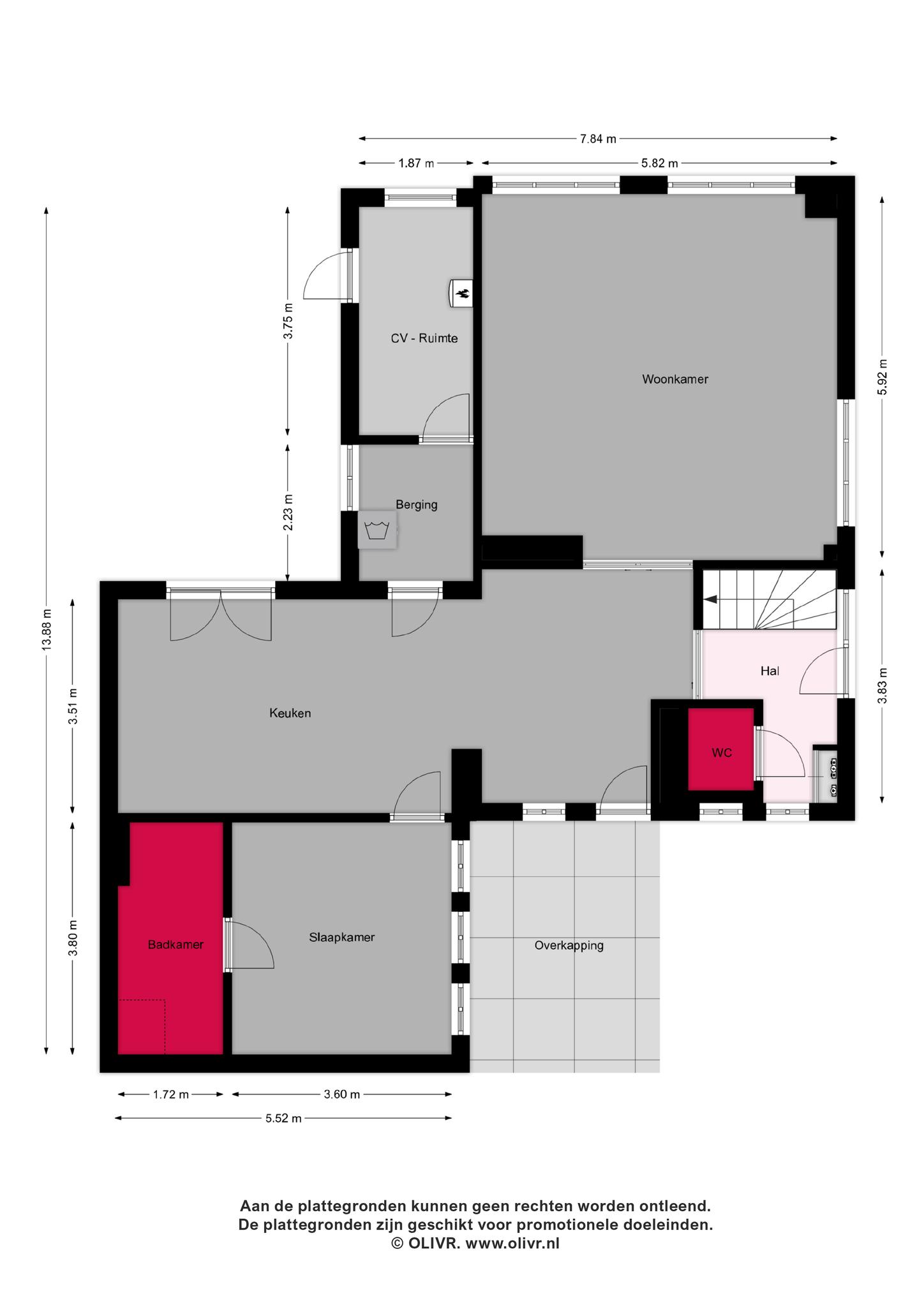 Begane grond: hal met fraaie trapopgang, meterkast, toiletruimte (casco) en schuifdeur naar open eet-/ zitkamer met deur naar overdekt terras; schuifdeuren naar ruime woonkamer aan de voorzijde; royale keukenruimte (leidingwerk aanwezig) met openslaande deuren en een hoog plafond met balken in het zicht; bijkeuken met witgoedaansluitingen; berging met cv-ruimte en zijingang; slaapkamer met hoog plafond met balken in het zicht; badkamer (casco).