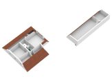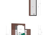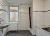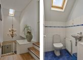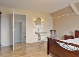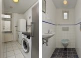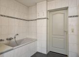 In het linkerdeel van de woning zijn een slaapkamer, de badkamer en bijkeuken gesitueerd. De slaapkamer, groot genoeg voor een tweepersoonsbed en een garderobekast, kan ook als kantoor-/praktijkruimte of speelkamer van de kinderen worden gebruikt. In de badkamer zie je een ligbad, aparte douche en een wastafel met spiegel en planchet. Voor de wasapparatuur en vriezer is de bijkeuken een goede plek.