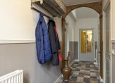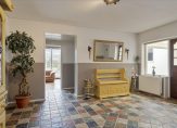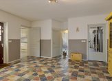 Aan de voorzijde is de entree van dit ruime, charmante huis. Vanuit de lange hal zijn de woonkamer, slaapkamer en de tweede hal te bereiken. Mooie elementen zijn het hoge plafond, de plavuizenvloer, lambrisering en paneeldeuren. De tweede hal is een grote entree waaraan de overige ruimtes op de begane grond grenzen.