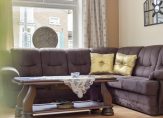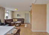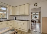 De gezellige woonkamer heeft veel lichtinval door de grote ramen, waarvan het merendeel aan de zuidkant is. Op de vloer ligt laminaat en er is een mooie verdeling tussen het zit- en eetgedeelte. Aansluitend is de dichte keuken, die groot genoeg is voor een ontbijttafel. De hoekopstelling met paneelfronten en granieten aanrechtblad is voorzien van diverse inbouwapparatuur: een keramische kookplaat, afzuigkap, vaatwasser, koelkast en een combi-oven/magnetron.