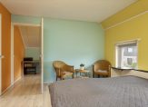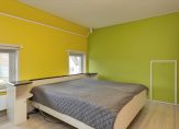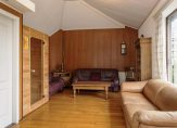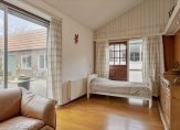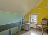 Verrassend is de aanbouw aan de achterzijde, waar een tuinkamer en de toiletruimte met fonteintje zijn. De tuinkamer, ingericht als zit-/slaapkamer, heeft een schuifpui en een aparte deur naar de diepe tuin. Op de vloer van deze lichte, multifunctionele ruimte ligt parket.