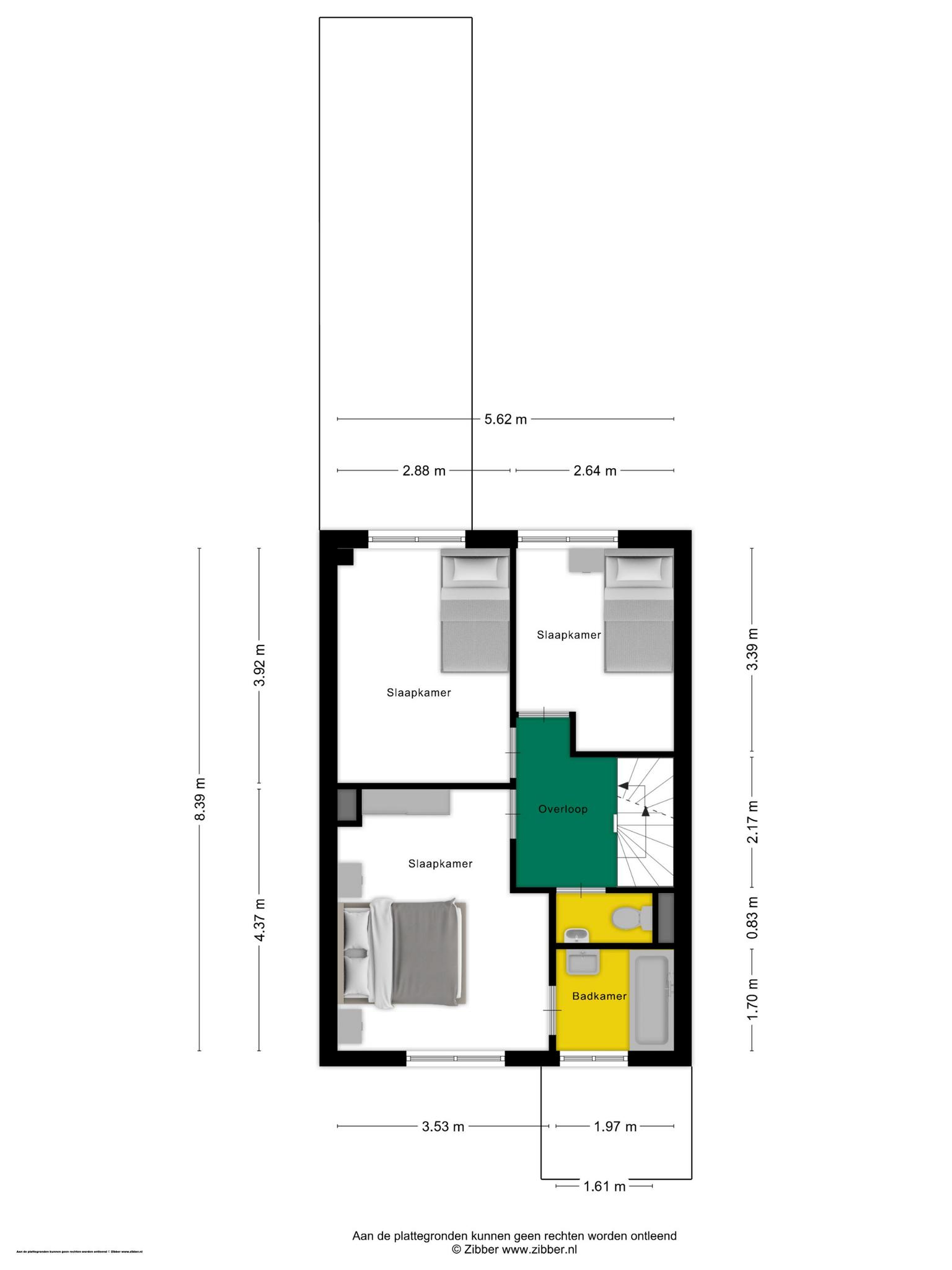 Op de verdieping bevinden zich drie slaapkamers, welke allen voorzien zijn van dubbele aluminium schuiframen. De slaapkamers hebben een ieder royaal oppervlak en zijn dankzij de rechte wanden praktisch in te delen. Vanuit de ouderslaapkamer is er toegang tot de badkamer, welke uitgevoerd is met een vaste wastafel en een ligbad. De toiletruimte bevindt zich separaat van de badkamer en is toegankelijk van uit de overloop.