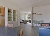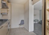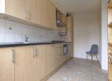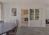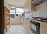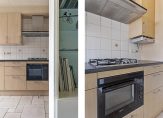 In de dichte keuken staat een wandopstelling met een houtlook en een donker aanrechtblad. De gaskookplaat, afzuigkap, oven, vaatwasser en koelkast zijn ingebouwd. Kies je voor de huidige indeling of voor een open keuken, met de mogelijkheid om een keuken in eilandopstelling te plaatsen?