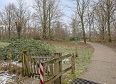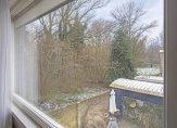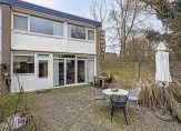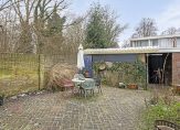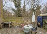 Vanuit de woonkamer en keuken is de achtertuin op het westen te bereiken, die aan een kant grenst aan het park. Een groot deel van de dag kun je in de zon zitten en ook aan de fietsen is gedacht, want er is genoeg plek in de stenen berging. Onder de overkapping is een poort naar de steeg, die links van het huis toegang geeft tot de openbare weg en aan de anderen kant naar een parkeerterrein leidt.