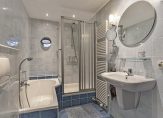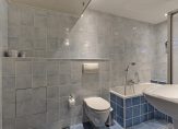 Leuk detail is het ronde raam in de badkamer, in de muur die grenst aan een slaapkamer aan de voorzijde. De badkamer is ingedeeld met een bad, aparte douche, tweede toilet, handdoekenradiator en een wastafel.