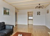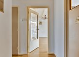 Het appartement heeft een ruime hal met een garderobenis, meterkast en laminaat op de vloer. Leuk detail is het stalraam, rechts van de badkamerdeur. Links in de hal is een deur met raam, die toegang geeft tot de woonkamer. Door de grote ramen aan de westkant valt veel licht naar binnen en het uitzicht naar de Mozartlaan is fraai. De airco-unit (koelen en verwarmen) zorgt gedurende het hele jaar voor een aangename temperatuur.