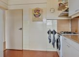 In de ruime, dichte keuken staat een lichte wandopstelling met een ingebouwde gaskookplaat en een afzuigkap. De originele provisiekast en servieskast zijn behouden, net als de wandtegels.