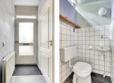 Enigszins verscholen achter het groen is de entree van deze lichte, kleurrijke woning. In de hal, naast de trap, is een garderobe en vanuit de hal is de toiletruimte, met fonteintje, te bereiken.
