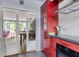 Achter de schuifdeuren is de keuken, waar de ochtendzon naar binnen valt. De hoekopstelling, felrood geschilderd, heeft een ingebouwde keramische kookplaat, afzuigkap, combimagnetron, vaatwasser, koelkast en een vriezer.