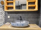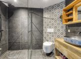 De moderne badkamer is ingedeeld met een grote inloopdouche, wandcloset en een houten wastafelmeubel. Er is gelet op details: zwarte kranen, patroontegels, een spiegelkast en een unieke wastafel.
