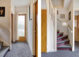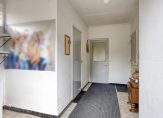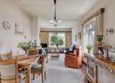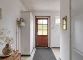De hal toont karakter, net als de rest van de woning. Fraaie elementen zijn de deurkozijnen en de binnendeuren. Rechts in de hal zijn de garderobe, trapopgang en de kelderkast.