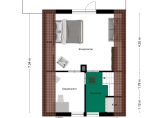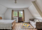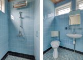Naast de keuken is een ruime bijkeuken, die samen met de keuken de mogelijkheid biedt om een woonkeuken te realiseren. De badkamer, net als de keuken met blauwe tegels, is ingedeeld met een toilet, wastafel en een douche. In de slaapkamer, met een inbouwkast, staan nu een eenpersoonsbed en een grote garderobekast. Ga je boven slapen, dan is deze kamer onder andere geschikt als werkkamer, speelkamer of eetkamer.
