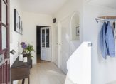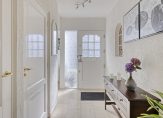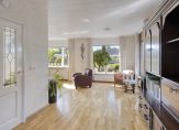 De entree van deze vrijstaande is woning is aan de rechterzijde. Je loop via de oprit naar de voordeur, die toegang geeft tot de lichte hal. Hier zijn de trapopgang, meterkast en de toiletruimte met fonteintje. Dankzij de lichte tegelvloer, en de lichte kleur op de muren, oogt de hal heel ruimtelijk.