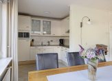 In de keuken ligt een tegelvloer, die qua kleur goed past bij de wandtegels en de keukenopstelling die rond 2005 is geplaatst. Het aanrechtblad is uitgevoerd in een granietlook en de keramische kookplaat, afzuigkap, koelkast en combimagnetron zijn ingebouwd.