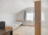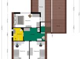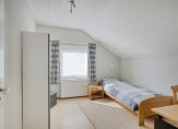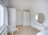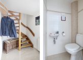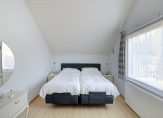 De master bedroom is aan de achterzijde, met mooi uitzicht naar de tuin, en de slaapkamers aan de voorzijde zijn qua grootte nagenoeg identiek. Wat opvalt zijn de grote ramen, laminaatvloer en de schuine dakvlakken met een hoge nok. In de master bedroom is een deur naar de berging, boven de bijkeuken. Hier hangt de HR-ketel, en de rest van de ruimte kan worden verbouwd tot kleedruimte of werk-/studeerplek.