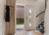 De buitenzijde met het donkere schilderwerk oogt fraai. Om de binnenkant te bewonderen, loop je naar de entree aan de rechterzijde. Open de kunststof voordeur naar de prachtige hal, met de trapopgang en een bergkast aan de linkerzijde. Aan de andere zijde is de ruime toiletruimte, ingedeeld met een wandcloset en een toiletmeubel.