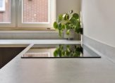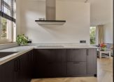 Tijdens de verbouwing is de muur tussen de woonkamer en keuken verwijderd, waardoor de keuken veel beter te gebruiken is. Je oog valt op de moderne hoekopstelling en de hoge kastenwand, die beiden veel bergruimte bieden. Alle benodigde apparatuur is ingebouwd: een inductie kookplaat, afzuigkap, vaatwasser, combi-oven en een koelkast. In de aanbouw is de ruime, goed afgewerkte bijkeuken met een aanrechtblad, spoelbak, boven-/onderkasten en de wasmachineaansluiting.