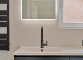 De badkamer, met raam in de zijgevel, is een fantastische ruimte met de juiste looks en veel comfort. Je oog vat op het grote wastafelmeubel met spiegel, de zwarte kranen, designradiator, het wandcloset en de ruime inloopdouche met regendouche.