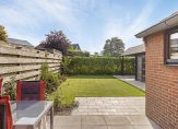Niet alleen de woning, maar ook de tuin heeft een strakke uitstraling en is goed onderhouden. Een breed pad verbindt het trottoir met de entree en de achtertuin, gesitueerd op het oosten. In de achtertuin zie je een mooi gazon, gevarieerde beplanting, een groot zonneterras en een houten berging met overdekt terras. Dit is een heerlijke plek om buiten te zitten, met uitzicht naar het groen in de tuin.
