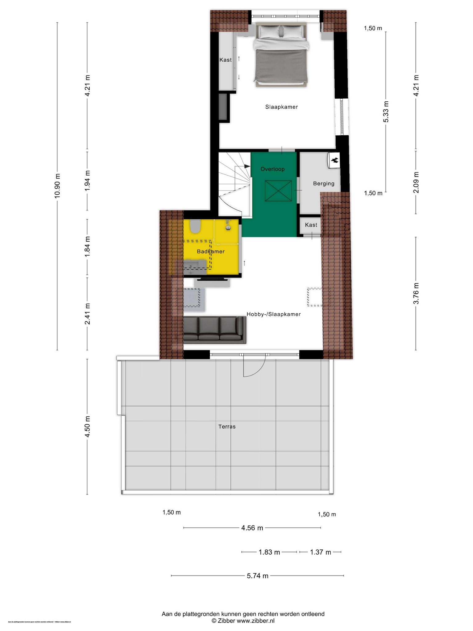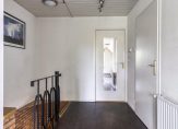 De overloop staat in open verbinding met een ruime hobby-/slaapkamer, die nu als tv- en muziekkamer in gebruik is. Deze ruimte grenst aan het dakterras en de badkamer (circa 10 jaar geleden vernieuwd) met een douche, toilet en een wastafelmeubel.
