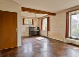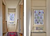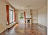 De woon-/eetkamer van bijna 7.50 meter breed is een lichte leefruimte, met ramen aan drie zijden en een deur naar de zijtuin. Drie ramen zijn uitgevoerd met glas in lood en naast de buitendeur zie je de compacte schouw met open haard.