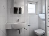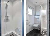 Vanuit de hoofdslaapkamer en vanuit de overloop is de vernieuwde badkamer te bereiken, ingedeeld met een douche, wandcloset en een extra brede wastafel. De badkamer is uitgevoerd in lichte kleuren, met inbouwverlichting in het plafond en een zwarte handdoekenradiator.