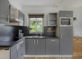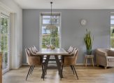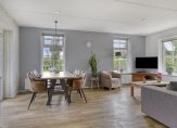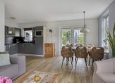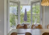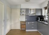 Aangrenzend vind je de open keuken, uitgerust met o.a. een koelkast, oven, vaatwasser en veel kastruimte. Vanuit de keuken kijk je uit over de tuin en stap je via openslaande deuren zó het terras op, ideaal om buiten te eten of te ontspannen.