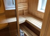Op de begane grond bevindt zich een ruime slaapkamer met aansluitend een badkamer met douche, wastafel en luxe saunaruimte: een ware wellnessbeleving aan huis.